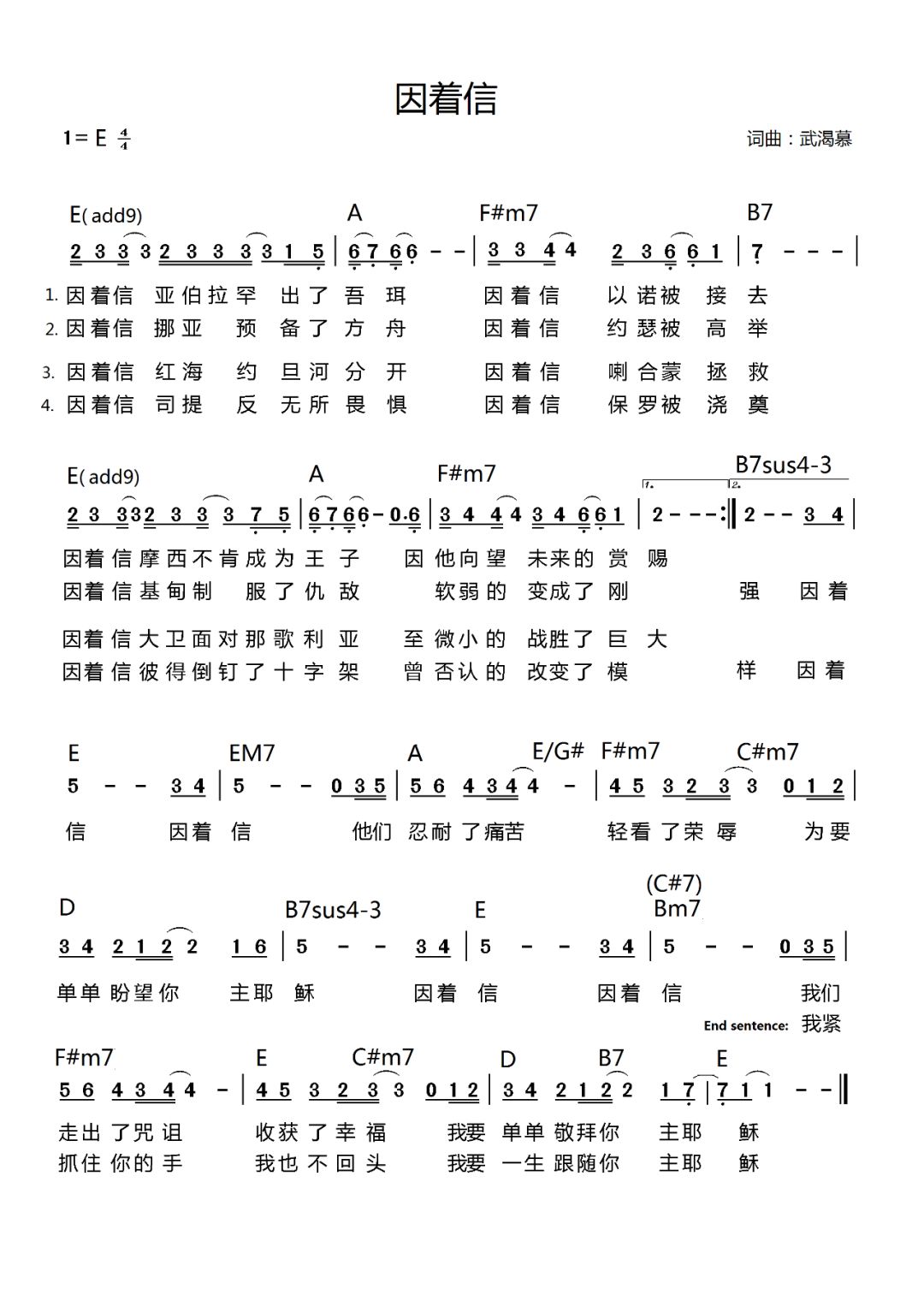 因着信歌谱 基督教歌谱